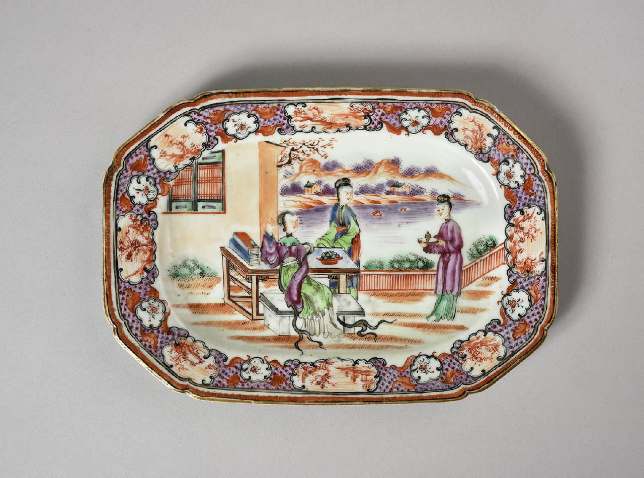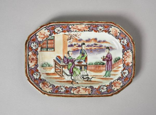 Vassoio piccolissimo.\nDecoro in stile cantonese a smalti color lavanda: in un giardino una nobildonna seduta su una panca è assistita da due dame, una delle quali le porge una tazza su un vassoio.\nLa tesa ha uno sfondo di rombi color lavanda con puntino a un vertice interrrotto da cartigli a nuvola con immagini stilizzate di paesaggio e decoro floreale.