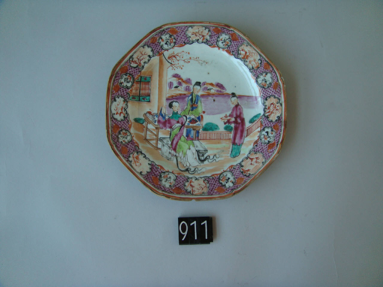 Piattino ottagonale.\nDecoro in stile cantonese a smalti color lavanda: in un giardino una nobildonna seduta su una panca è assistita da due dame, una delle quali le porge una tazza su un vassoio.\nLa tesa ha uno sfondo di rombi color lavanda con puntino a un vertice interrrotto da cartigli a nuvola con immagini stilizzate di paesaggio e decoro floreale.