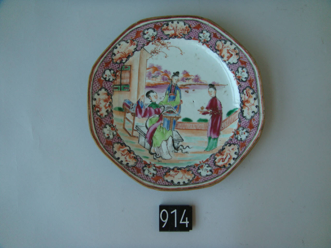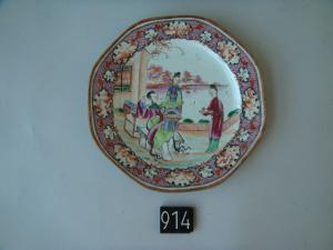 Piattino ottagonale.\nDecoro in stile cantonese a smalti color lavanda: in un giardino una nobildonna seduta su una panca è assistita da due dame, una delle quali le porge una tazza su un vassoio.\nLa tesa ha uno sfondo di rombi color lavanda con puntino a un vertice interrrotto da cartigli a nuvola con immagini stilizzate di paesaggio e decoro floreale.