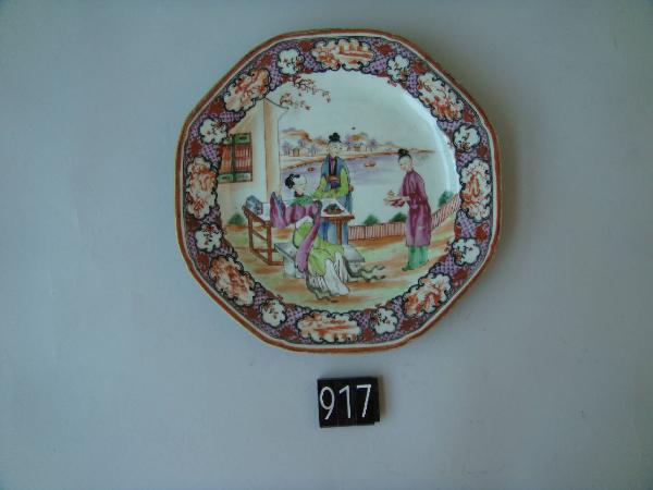 Piattino ottagonale.\nDecoro in stile cantonese a smalti color lavanda: in un giardino una nobildonna seduta su una panca è assistita da due dame, una delle quali le porge una tazza su un vassoio.\nLa tesa ha uno sfondo di rombi color lavanda con puntino a un vertice interrrotto da cartigli a nuvola con immagini stilizzate di paesaggio e decoro floreale.