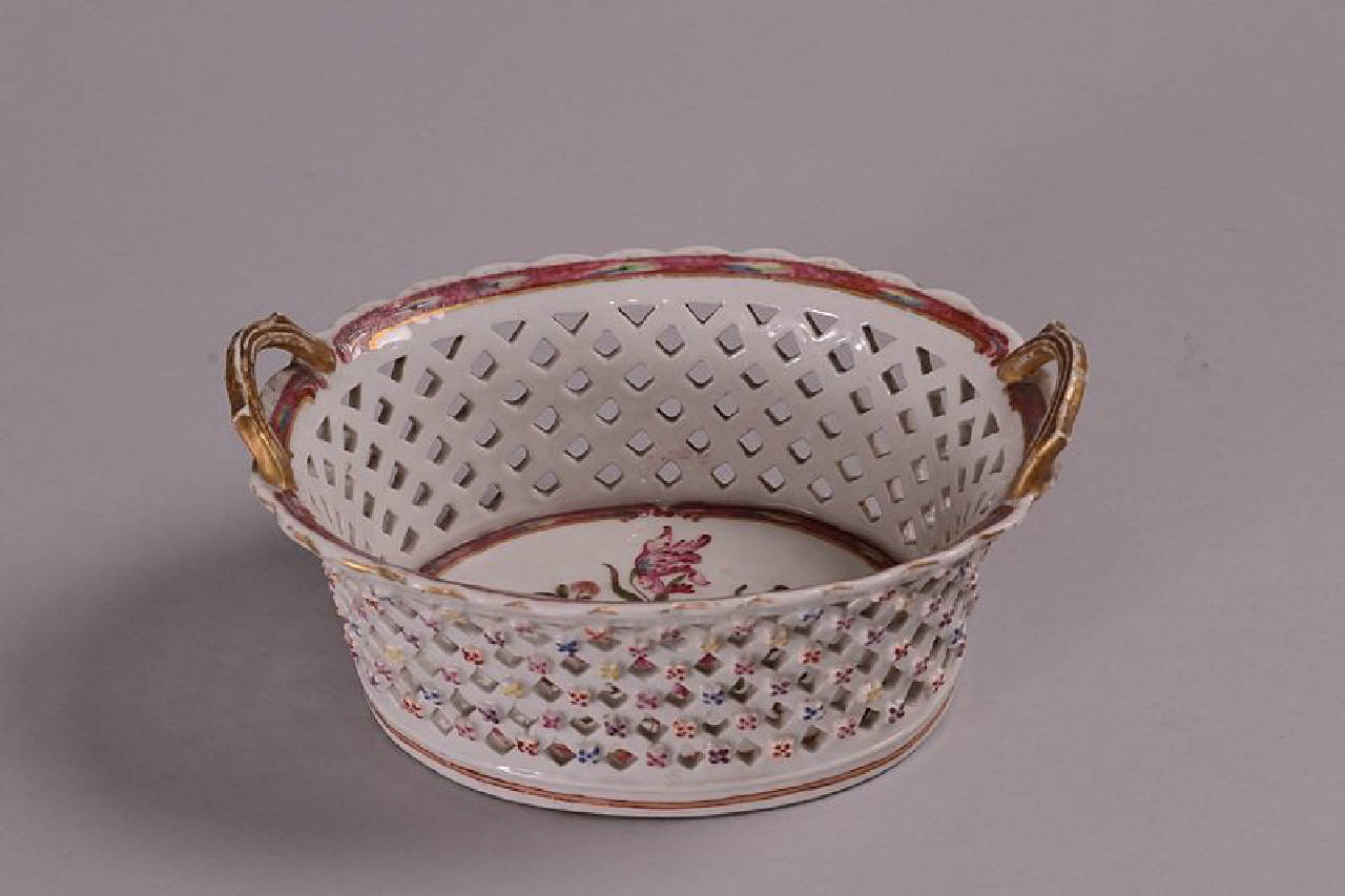 Cestello ovale a due manici, traforato a giorno a piccoli rombi decorati esternamente di fiorellini a rilievo. All'interno, sul fondo grigio, gruppi di fiori policromi raccolti a mazzo entro delineatura ovale. In alto, orlo a colori e manici dorati.