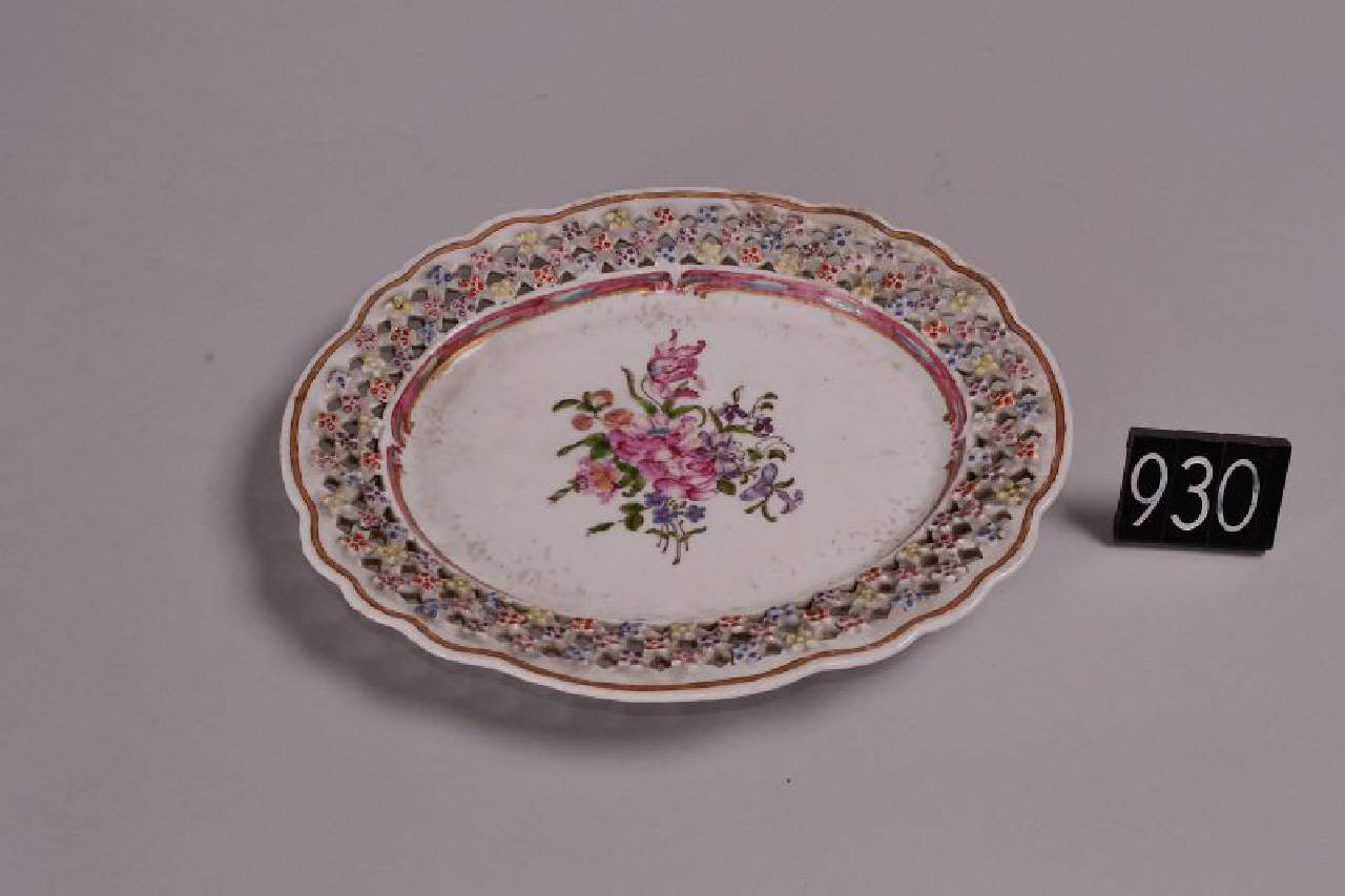 Piattino ovale (per cestello n. 929) ad orlo frastagliato e tesa traforata a giorno con fiorellini policromi a rilievo. Al centro gruppo di fiori raccolti a mazzo entro cornice delineata in colori policromi. All'orlo filettature in oro.