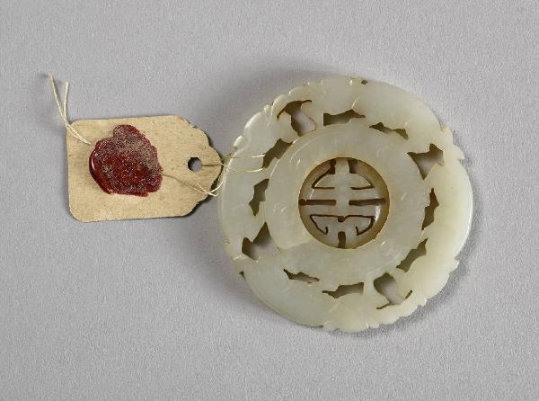 Piastrina di giada color celadon dalla forma circolare scolpita e traforata con animali sul perimetro e il carattere di longevità al centro. Su un cartellino, il sigillo doganale di lacca