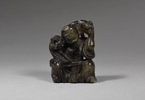 Piccola scultura in pietra dura, nera, raffigurante un personaggio con una moneta in mano e un animale sulla spalla.