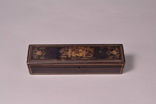 Scatola per ventaglio, di forma rettangolare, con coperchio in legno laccato in nero con decori a dorature di figure in scene di paesaggioScatoletta in lacca decorata in oro. L'interno sagomato. Con giunture in metallo e bottoncino per l'apertura.