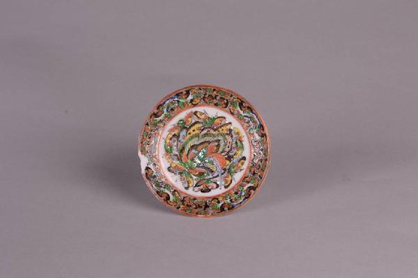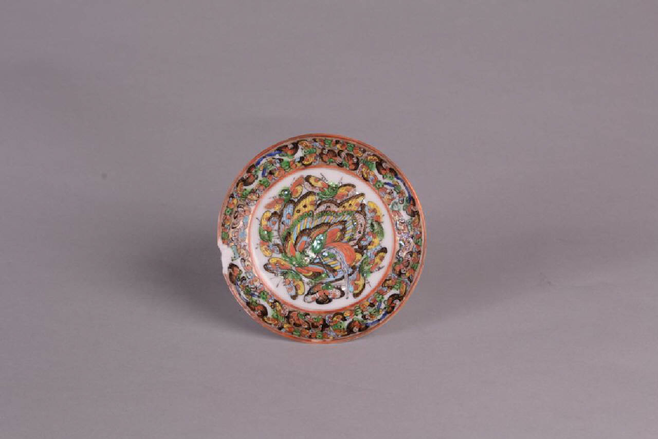 Piattino di una serie di 4 (C963-C965-C966). In porcellana a smalti policromi sopracoperta con decoro di numerose farfalle in volo e banda a motivi floreali.