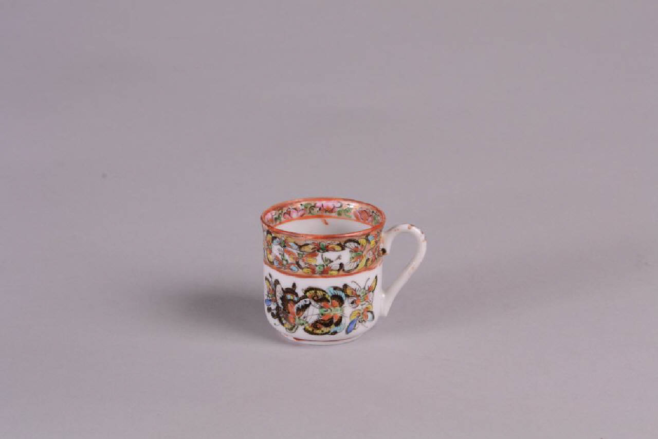 Tazzina con manico di una serie di 4 (C967-969-970).In porcellana a smalti policromi sopracoperta con decoro di numerose farfalle in volo e banda a motivi floreali.
