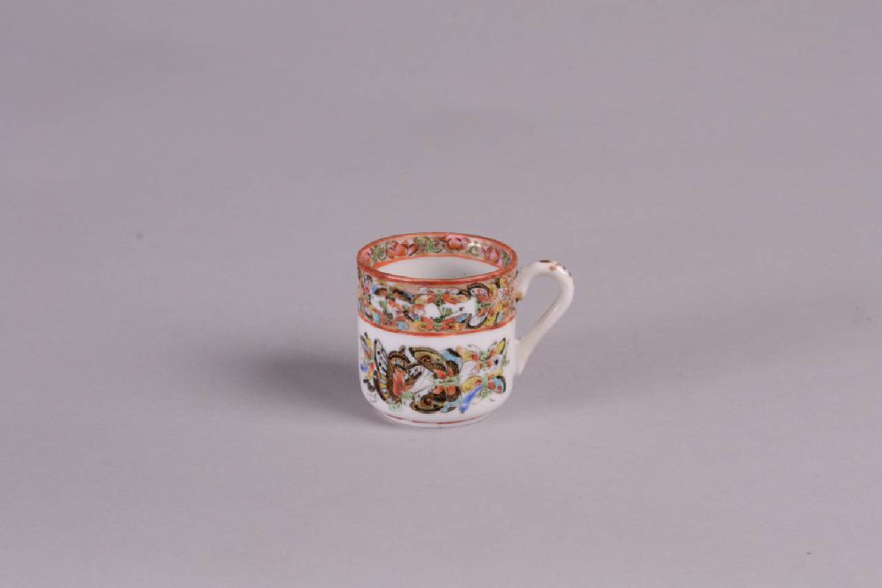 Tazzina con manico di una serie di 4 (C967-968-970).In porcellana a smalti policromi sopracoperta con decoro di numerose farfalle in volo e banda a motivi floreali.