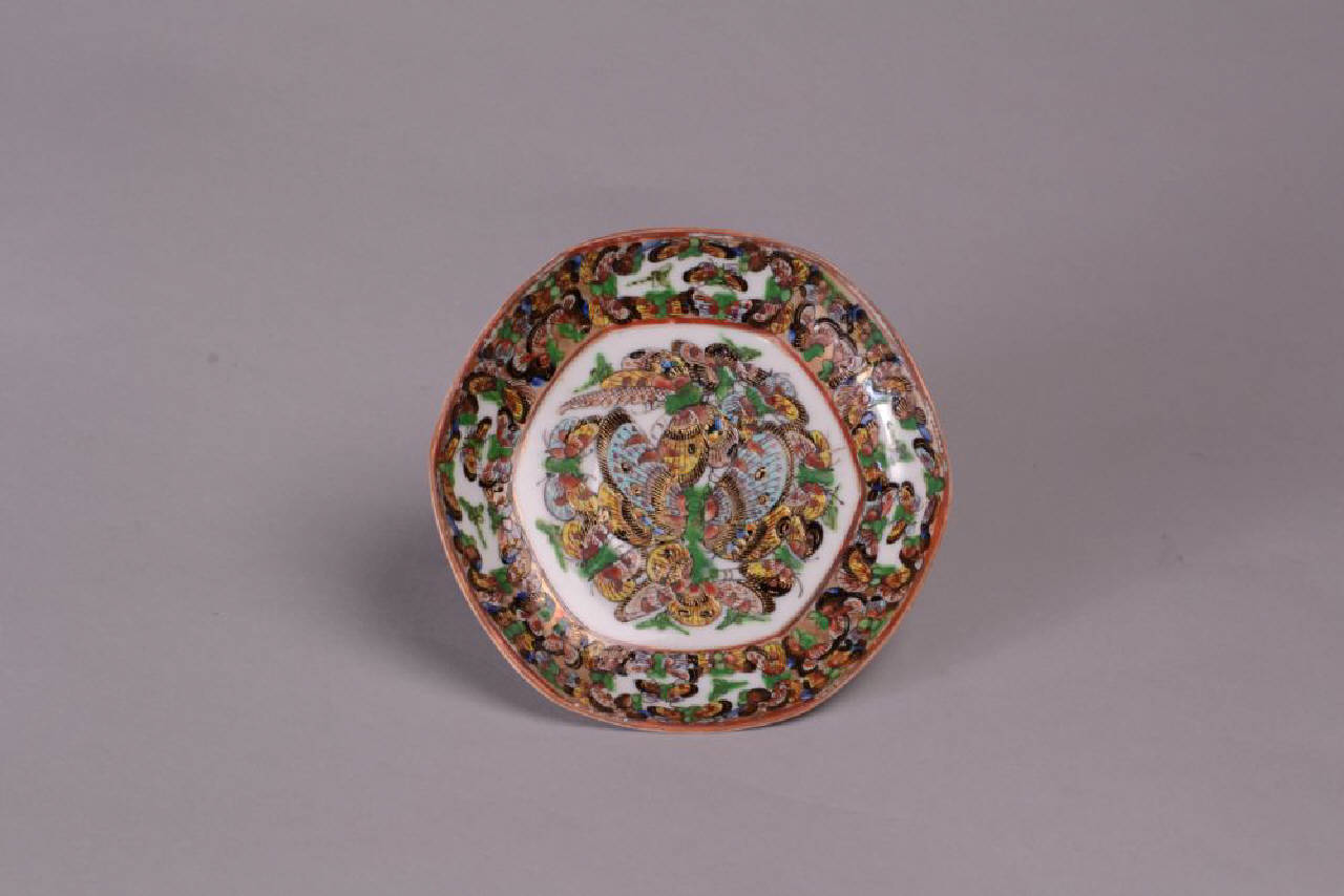 Piattino esagonale di una serie di 6 (C972-973-974-975-976). In porcellana a smalti policromi sopracoperta con decoro di numerose farfalle in volo e banda a motivi floreali.