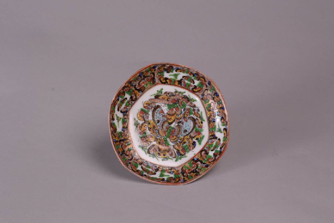 Piattino esagonale di una serie di 6 (C971-972-973-974-976). In porcellana a smalti policromi sopracoperta con decoro di numerose farfalle in volo e banda a motivi floreali.