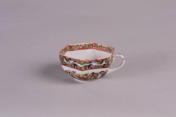 Tazzina esagonale di una serie di 6 (C978-979-980-981-982). In porcellana a smalti policromi sopracoperta con decoro di numerose farfalle in volo e banda a motivi floreali.