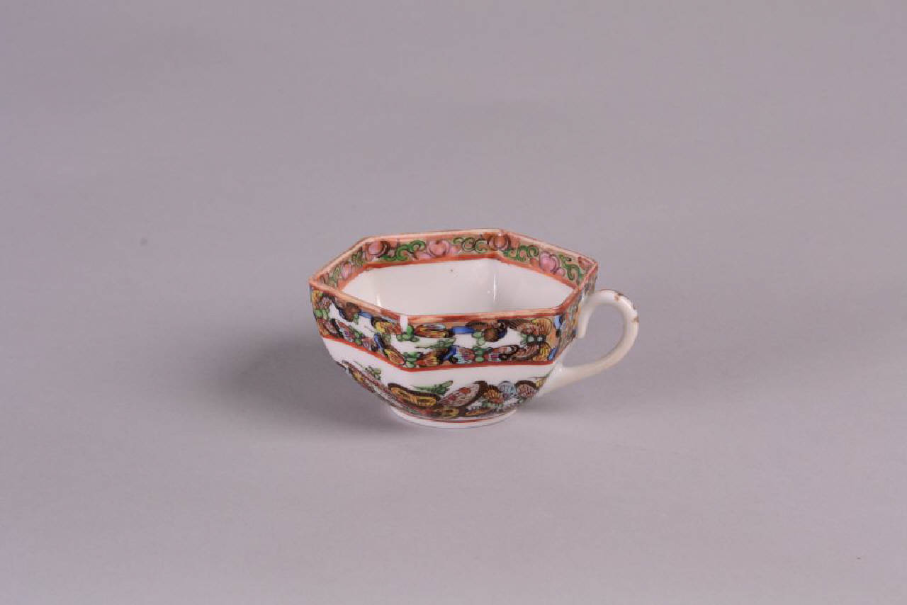Tazzina esagonale di una serie di 6 (C977-978-980-981-982). In porcellana a smalti policromi sopracoperta con decoro di numerose farfalle in volo e banda a motivi floreali.