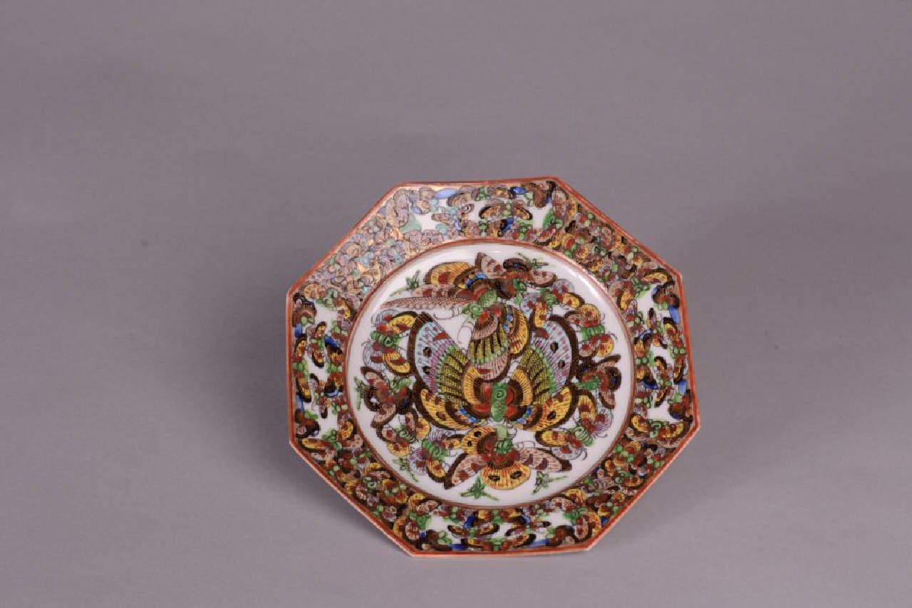 Piattino ottagonale di una serie di 7 (C983-984-985-986-987-989). In porcellana a smalti policromi sopracoperta con decoro di numerose farfalle in volo e banda a motivi floreali.