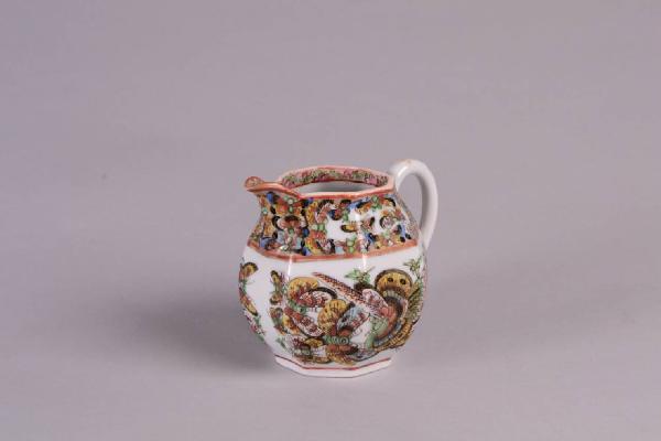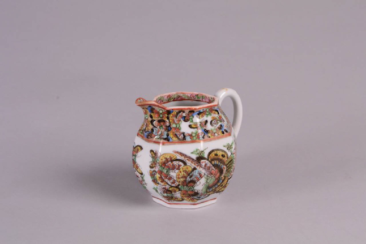 Lattiera In porcellana a smalti policromi sopracoperta con decoro di numerose farfalle in volo e banda a motivi floreali.