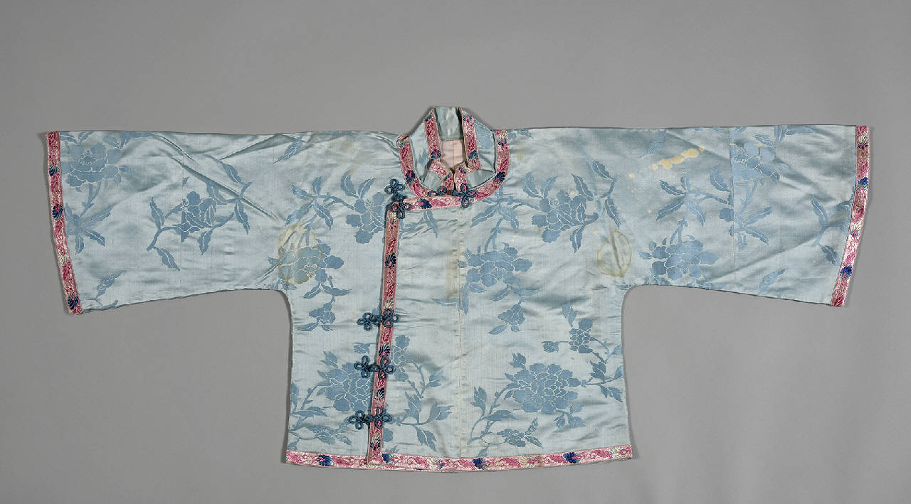 Blusa da bambino in seta celeste operata, decorata con peonie, con allacciatura laterale e bordo ricamato su fondo rosa, foderata in rosa (con inv. n. C 996 forma un completo)