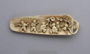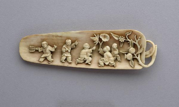 Poggiapennelli ricavato da una sezione longitudinale di zanna di tricheco intagliata con le figure di cinque bambini in fila e un racemo con frutti e fiori. Un bambino regge un ventaglio, un'altro un grosso fiore di loto.
