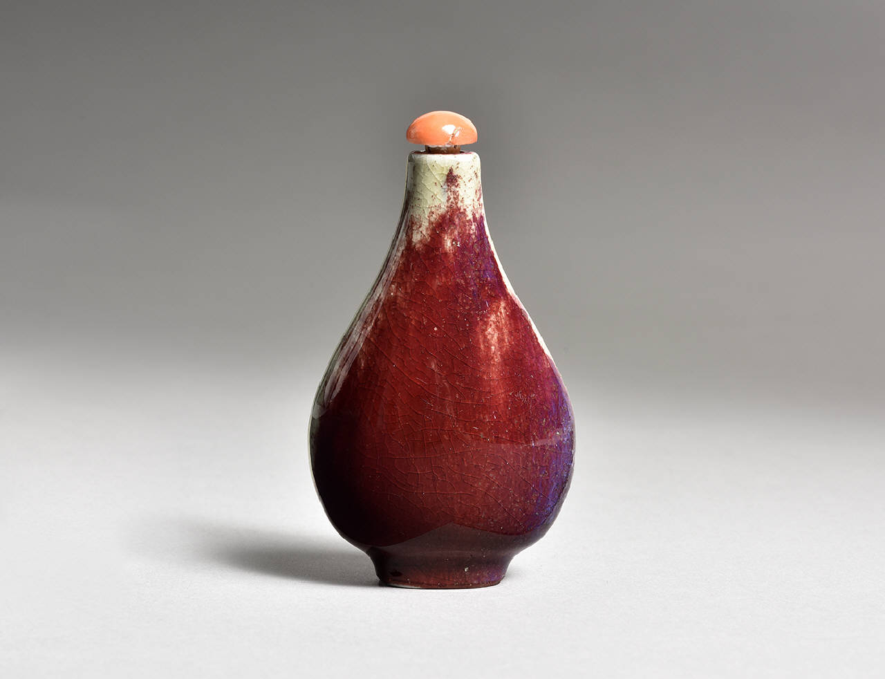 Bottiglietta per tabacco da fiuto a forma di fiasca schiacciata con spalla spiovente e tappo di pietra arancione contenente tracciolo e cucchiaino di avorio. L'oggetto presenta una doppia invetriatura definita "rosso di pesca" ottenuta screziatre rosse e viola su fondo trasparente nello stile detto anche yaobian o jun.