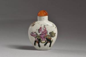 Bottiglietta per tabacco da fiuto in porcellana bianca a forma di fiasca schiacciata con piede rastremato e alta spalla terminante a collo cilindrico. La bocca è sormontata da un tappo di vetro semisferico con all'interno il turacciolo con al centro il cucchiaino di avorio. Su un lato la bottiglietta è decorata a smalti della famiglia rosa (yancai) a motivo di animale mitico qilin cavalcato da un bambino con un lungo bastone. Sulla spalla un airone bianco e dal lato opposto un cesto di vimini con dentro funghi della longevità (lingzhi) e foglie. Sull'altro lato, al centro, si trova una pagoda con nuvole stilizzate.