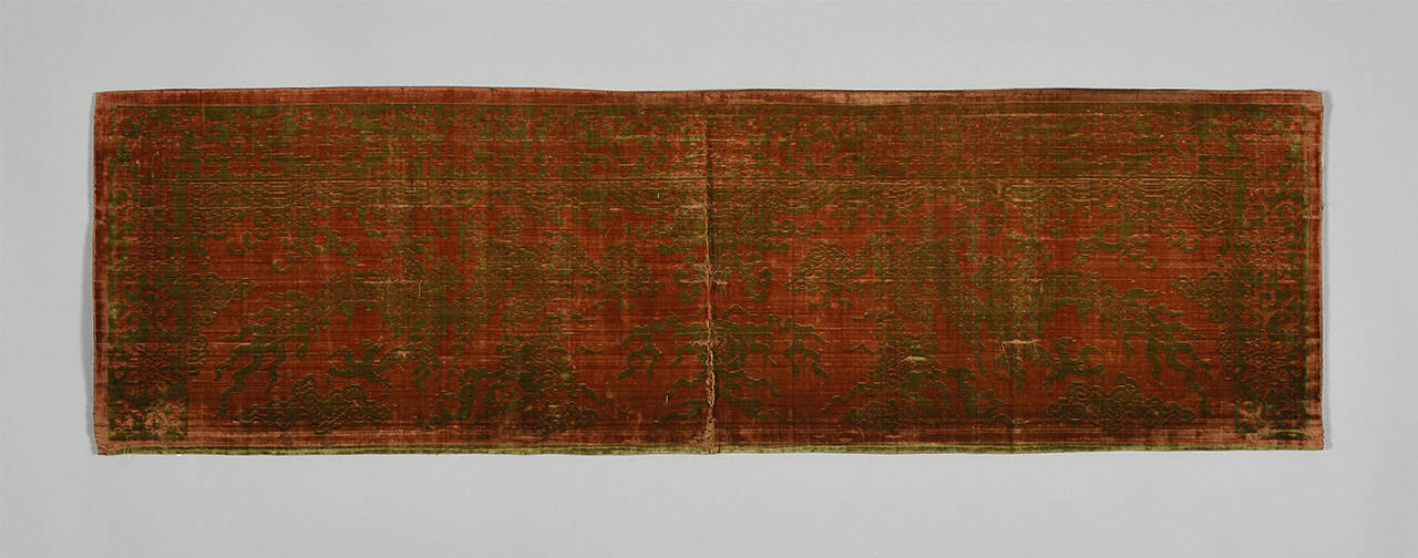 Tappeto da sella di forma rettangolare, in velluto verde su fondo rosso con motivi di draghi affrontati che inseguono la perla buddista.