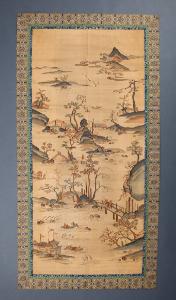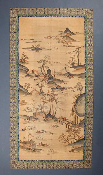 Grande arazzo "kesi" in seta operata e ricamata in policromia raffigurante il lago di Hangzhou con le tipiche isole con padiglioni, unite da ponti. In basso, due uomini attraversano un ponte a dorso d'asino. Qua e là barche con barcaioli. In alto uno stormo di uccelli. Il tessuto è montato entro cornice a tre fasce di seta broccata, rispettivamente di colore blu, verde e giallo. Foderato sul retro con seta verde.
