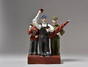 Gruppo in porcellana policroma composto da operaio, contadino e soldato con libretto rosso e bandiera della Repubblica Poplare Cinese.