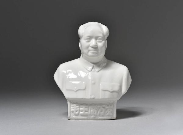 Busto in porcellana a invetriatura bianca raffigurante Mao Zedong, con scritta in rilievo "mao zhu xi wan sui" - lunga vita a Mao Zhu Xi