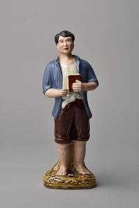 Scultura in porcellana policroma di figura popolare vestito in abiti semplici con in mano il libretto rosso.
