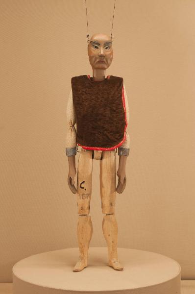 Testa in legno di tiglio fissata al corpo tramite ferro, occhi di vetro. Corpo in tiglio tagliato in vita e raccordato con viti ad anello e tela a coprire. Gambe unite al bacino tramite bordione in ferro, ginocchia ad incastro mobile. Mani in tiglio con dita scolpite ma unite a spatola. Bilancino tradizionale per coppie.