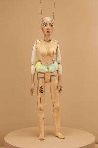 Testa in legno di tiglio fissata al corpo tramite ferro, occhi di vetro. Corpo normale in abete. Gambe unite al bacino tramite bordione in ferro, ginocchia ad incastro mobile. Mani in tiglio con dita scolpite e separate. Bilancino tradizionale per coppie.