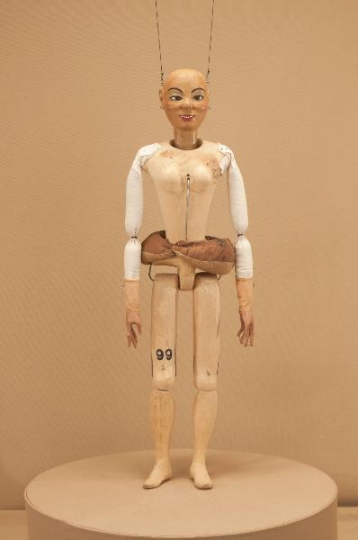 Testa in legno di tiglio fissata al corpo tramite ferro, occhi di vetro. Corpo normale in abete. Gambe unite al bacino tramite bordione in ferro, ginocchia ad incastro mobile. Mani mobili in tiglio con dita scolpite e separate. Bilancino a croce metodo Holden.