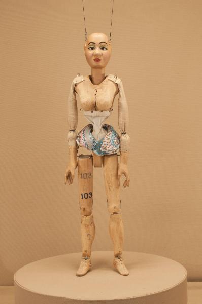 Testa in legno di tiglio fissata al corpo tramite ferro, occhi di vetro. Corpo normale in tiglio tagliato in vita e raccordato con cerniera in metallo. Gambe unite al bacino tramite bordione in ferro, ginocchia ad incastro mobile. Mani in tiglio con dita scolpite e separate. Piedi mobili. Bilancino a croce metodo Holden.