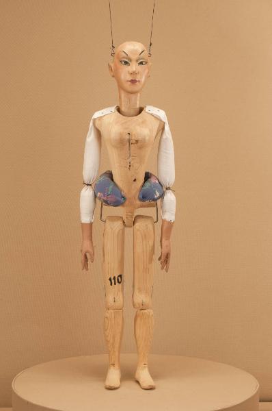 Testa in legno di tiglio fissata al corpo tramite ferro, occhi di vetro dipinti da dietro. Corpo normale in abete. Gambe unite al bacino tramite bordione in ferro, ginocchia ad incastro mobile. Mani in tiglio con dita scolpite e separate. Bilancino a croce per coppie.