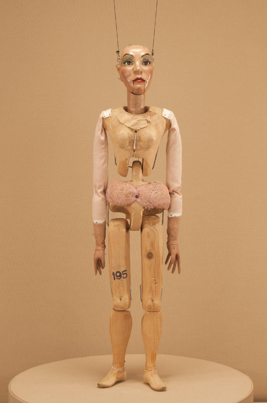 Testa in legno di tiglio fissata al corpo tramite ferro, occhi di vetro. Bocca mobile. Corpo normale in abete snodato in vita ad incastro. Gambe unite al bacino tramite bordione in ferro, ginocchia ad incastro mobile. Mani mobili in tiglio con dita scolpite e separate. Bilancino a croce metodo Holden.