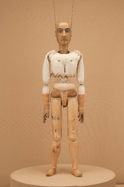 Testa in legno di tiglio fissata al corpo tramite ferro, occhi di vetro dipinti da dietro. Corpo normale in tiglio tagliato in vita e raccordato con viti ad anello. Petto imbottito con cotone. Gambe unite al bacino tramite bordione in ferro, ginocchia ad incastro mobile. Piedi mobili. Mani in tiglio mobili con dita scolpite e separate. Bilancino a croce per coppie.
