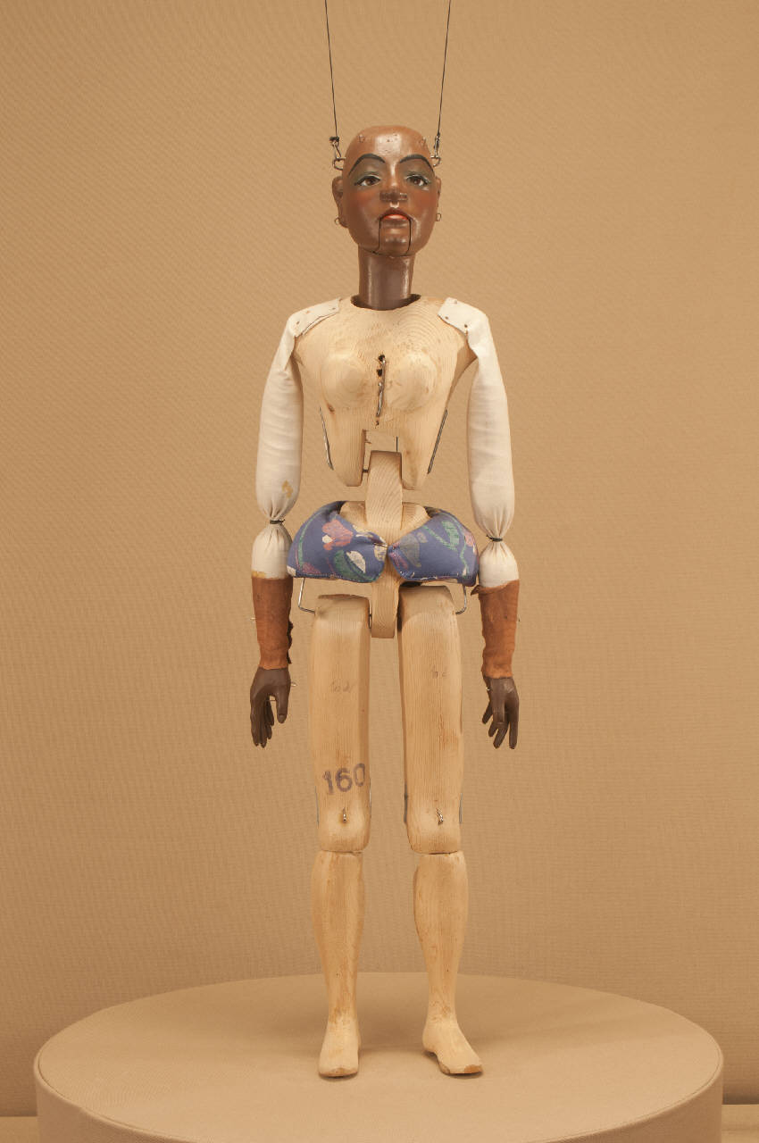 Testa in legno di tiglio fissata al corpo tramite ferro, occhi di vetro. Corpo normale in abete tagliato in vita e raccordato con viti ad anello e stoffa. Gambe unite al bacino tramite bordione in ferro, ginocchia ad incastro mobile. Mani mobili in tiglio con dita scolpite e separate. Bilancino a croce metodo Holden.