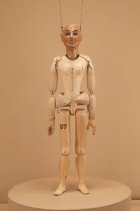 Testa di legno di tiglio fissata al corpo tramite ferro, occhi di vetro. Bocca mobile. Corpo normale in abete. Gambe unite al bacino tramite bordione in ferro, ginocchia ad incastro mobile. Mani in tiglio mobili con dita scolpite e separate. Bilancino a croce metodo Holden.
