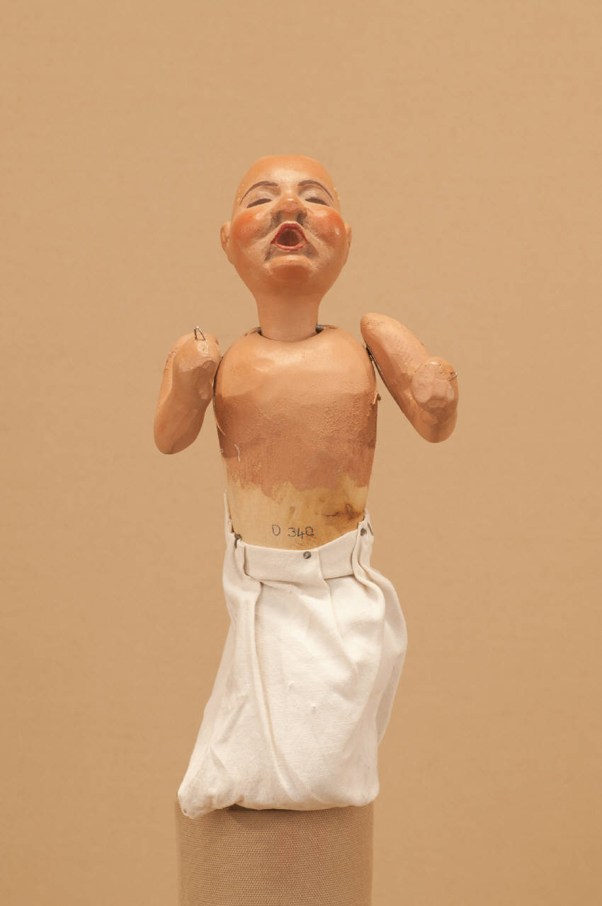 Testa di legno di tiglio fissata al corpo tramite ferro. Corpo e braccia in tiglio. Tasca in tela imbottita di gommapiuma.