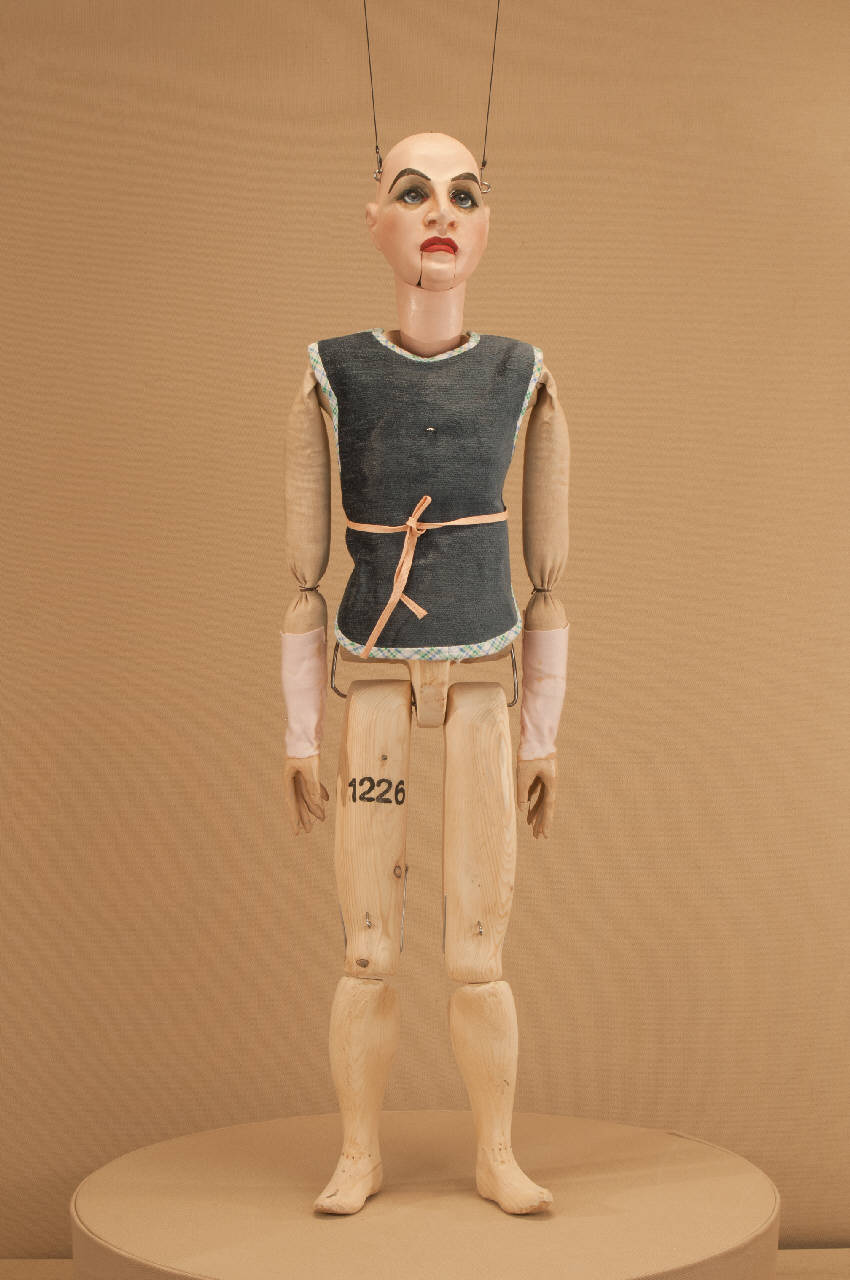 Testa di legno di tiglio fissata al corpo tramite ferro, occhi di vetro, bocca mobile. Corpo normale in abete snodato in vita ad incastro. Gambe unite al bacino tramite bordione in ferro, ginocchia ad incastro mobile. Mani mobili in tiglio con dita scolpite e separate. Bilancino a croce metodo Holden.