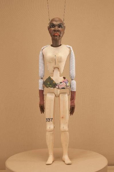 Testa di legno di tiglio fissata al corpo tramite ferro, occhi di vetro, bocca mobile. Corpo normale in abete snodato in vita ad incastro. Gambe unite al bacino tramite bordione in ferro, ginocchia ad incastro mobile. Mani mobili in tiglio con dita scolpite e separate. Bilancino a croce metodo Holden.