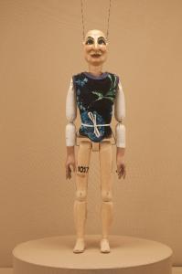 Testa in legno di tiglio fissata al corpo tramite ferro, occhi di vetro. Corpo normale in abete. Gambe unite al bacino tramite bordione in ferro, ginocchia ad incastro mobile. Mani in tiglio con dita scolpite e separate. Bilancino a croce metodo Holden.