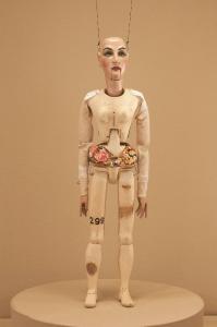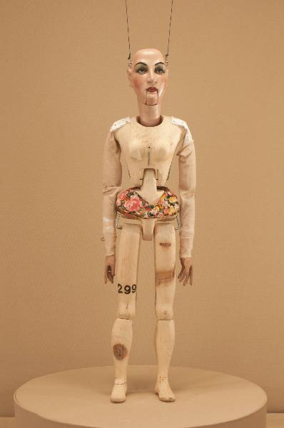 Testa di legno di tiglio fissata al corpo tramite ferro, occhi di vetro. Bocca mobile. Corpo normale in abete snodato in vita ad incastro. Gambe unite al bacino tramite bordione in ferro, ginocchia ad incastro mobile. Mani in tiglio mobili con dita scolpite e separate. Bilancino a croce per coppie.