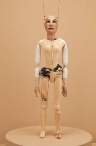 Testa di legno di tiglio fissata al corpo tramite ferro, occhi di vetro. Bocca mobile. Corpo normale in abete. Gambe unite al bacino tramite bordione in ferro, ginocchia ad incastro mobile. Mani in tiglio mobili con dita scolpite e separate. Bilancino a croce per coppie.
