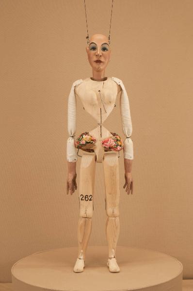 Testa di legno di tiglio fissata al corpo tramite ferro, occhi di vetro. Corpo normale in abete snodato in vita con cerniera in ferro. Gambe unite al bacino tramite bordione in ferro, ginocchia ad incastro mobile. Mani in tiglio con dita scolpite e separate. Piedi mobili. Bilancino a croce metodo Holden.