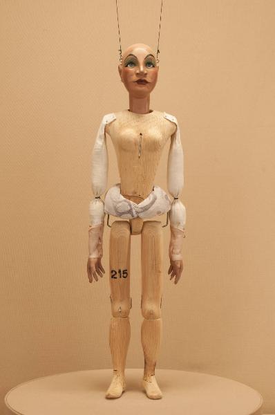 Testa di legno di tiglio fissata al corpo tramite ferro, occhi di vetro. Corpo normale in abete. Gambe unite al bacino tramite bordione in ferro, ginocchia ad incastro mobile. Mani mobili in tiglio con dita scolpite e separate. Bilancino tradizionale per coppie.