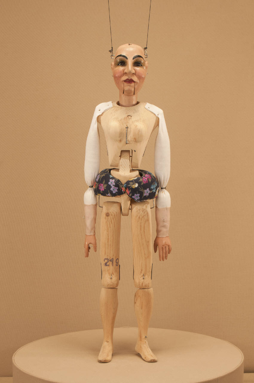 Testa di legno di tiglio fissata al corpo tramite ferro, occhi di vetro. Bocca mobile. Corpo normale in abete tagliato in vita con raccordo ad incastro. Gambe unite al bacino tramite bordione in ferro, ginocchia ad incastro mobile. Mani mobili in tiglio con dita scolpite e separate. Bilancino a croce metodo Holden.