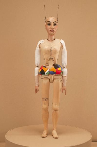 Testa di legno di tiglio fissata al corpo tramite ferro, occhi di vetro. Bocca mobile. Corpo normale in abete tagliato in vita con raccordo ad incastro. Gambe unite al bacino tramite bordione in ferro, ginocchia ad incastro mobile. Mani mobili in tiglio con dita scolpite e separate. Bilancino a croce metodo Holden.