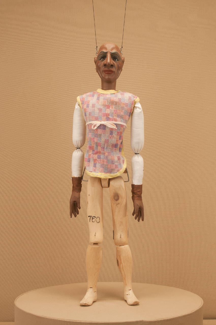 Testa di legno di tiglio fissata al corpo tramite ferro, occhi di vetro. Corpo normale in abete tagliato in vita ad incastro. Gambe unite al bacino tramite bordione in ferro, ginocchia ad incastro mobile. Mani mobili in tiglio con dita scolpite e separate. Bilancino a croce metodo Holden.