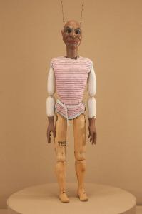 Testa di legno di tiglio fissata al corpo tramite ferro, occhi di vetro. Corpo normale in abete. Gambe unite al bacino tramite bordione in ferro, ginocchia ad incastro mobile. Mani in tiglio con dita scolpite e separate. Bilancino a croce metodo Holden.