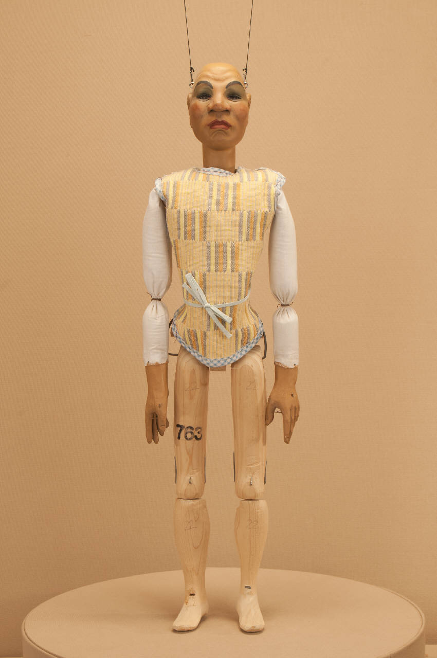 Testa di legno di tiglio fissata al corpo tramite ferro, occhi di vetro. Corpo normale in abete. Gambe unite al bacino tramite bordione in ferro, ginocchia ad incastro mobile. Mani in tiglio con dita scolpite e separate. Bilancino a croce per coppie.