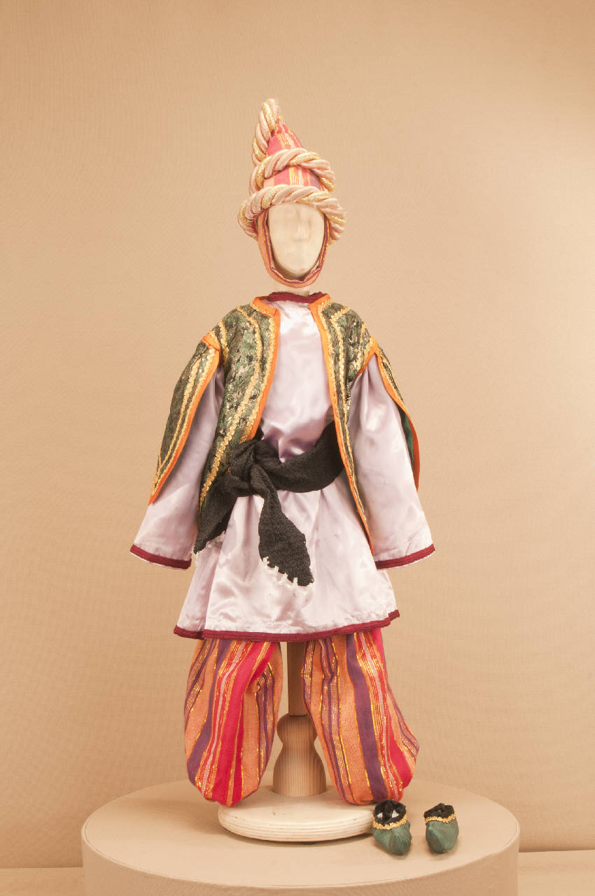 Costume fantastico orientale composto da pantaloni, bolero, veste, fusciacca, soggolo e scarpe. Il cappello che completa il costume ha il codice GOR 03375.